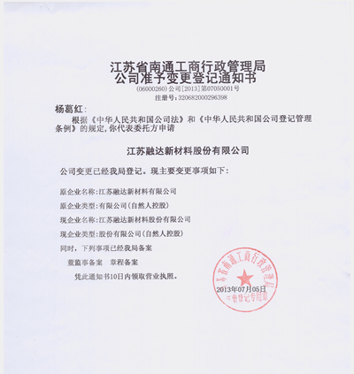為推動可持續(xù)發(fā)展,為公司邁入資本市場做準備,公司全體股東投票決定同意將江蘇融達新材料有限公司更名為江蘇融達新材料股份有限公司,并提交江蘇省工商行政管理局審批通過。